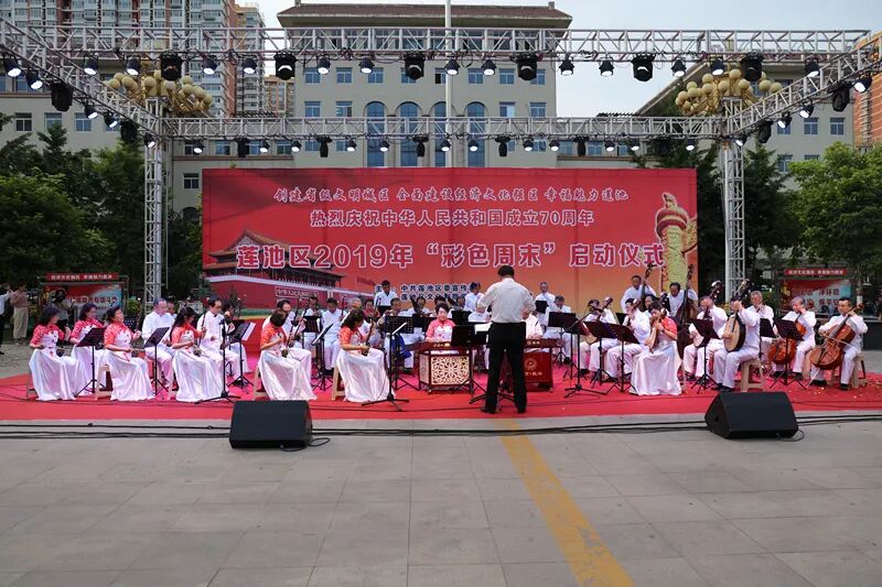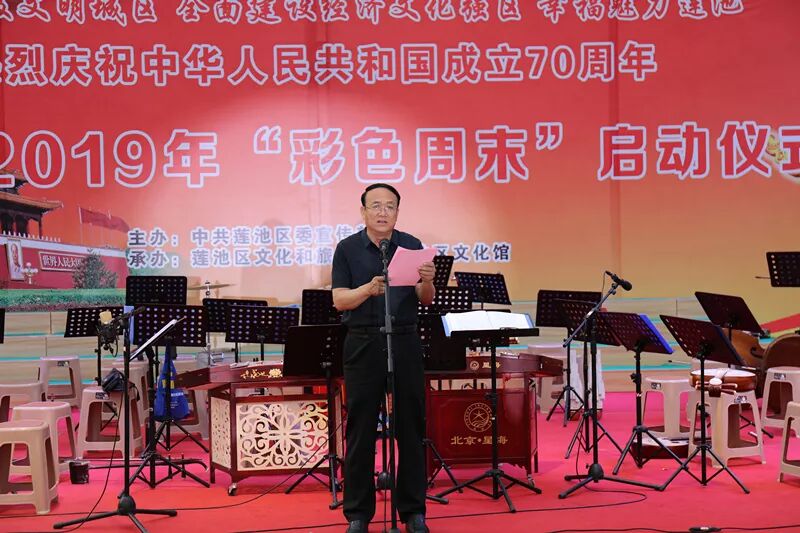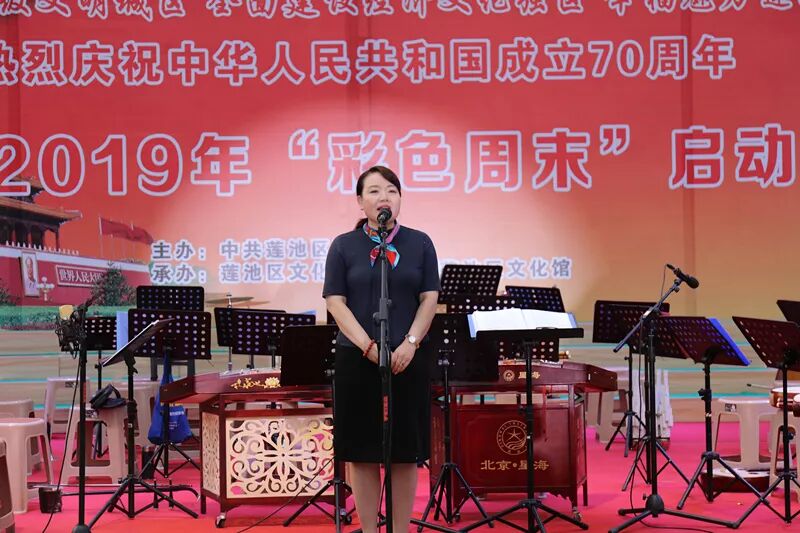 为庆祝中华人民共和国成立70周年,宣传贯彻落实习近平新时代中国特色社会主义思想和党的十九大精神,进一步讴歌新时代、激荡正能量,以文艺的形式助力保定市创建全国文明城市、莲池区创建省级文明城区,推动和繁荣莲池区文化艺术事业的发展,全面活跃群众文化生活,展示人民群众幸福健康、昂扬向上的精神风貌,5月31日,由中共莲池区委宣传部主办,莲池区文化和旅游局、莲池区文化馆承办的“庆祝中华人民共和国成立70周年暨2019年莲池区彩色周末系列活动启动仪式”在莲池区人民政府北院广场隆重举行。区委常委、宣传部长罗晓瑞致辞,区政府副区长张立辉宣布活动开幕。